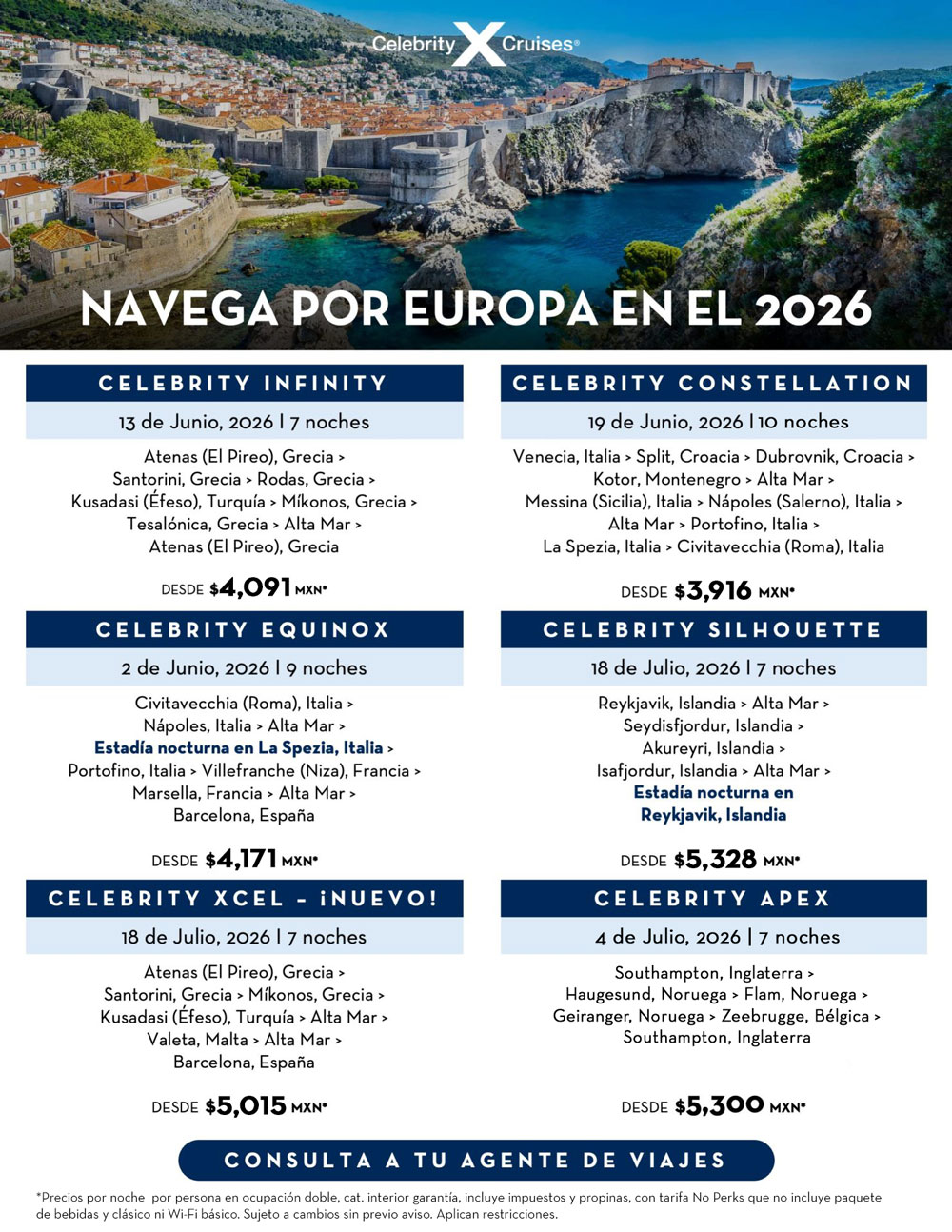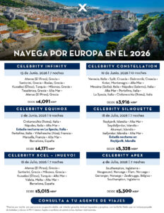 Gran Venta Semestral de Celebrity Cruises: obtén hasta 75% de descuento en el segundo pasajero + ahorros de hasta $14,000 pesos por cabina + 3ro y 4to pasajero navegan gratis. Desde $3,916 pesos por noche por persona para salir en junio y julio 2026, incluye impuestos y propinas.